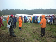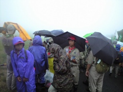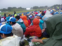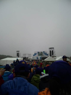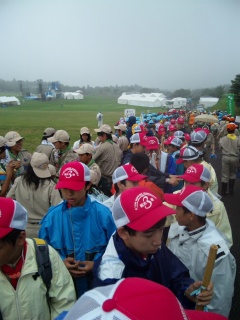 開会式中は、雨が降ったり止んだり、また濃い霧で正面モニターが見えなかったりしたようです。