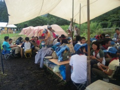 ボーイスカウトは午前のプログラムから戻って、お昼ごはんです。