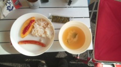 メニューは、ご飯、オムレツ、ウインナー、焼きのり、味噌汁。